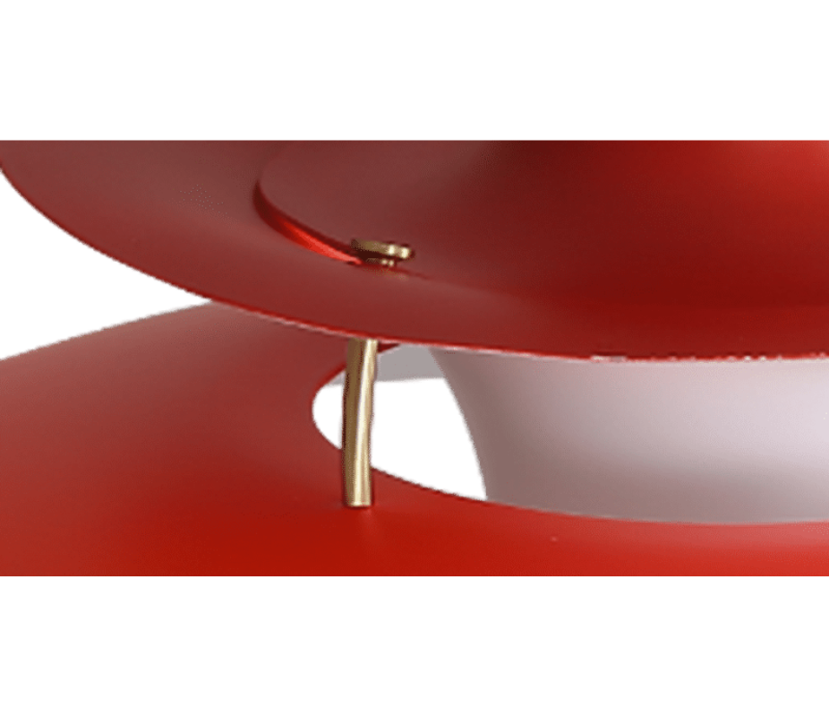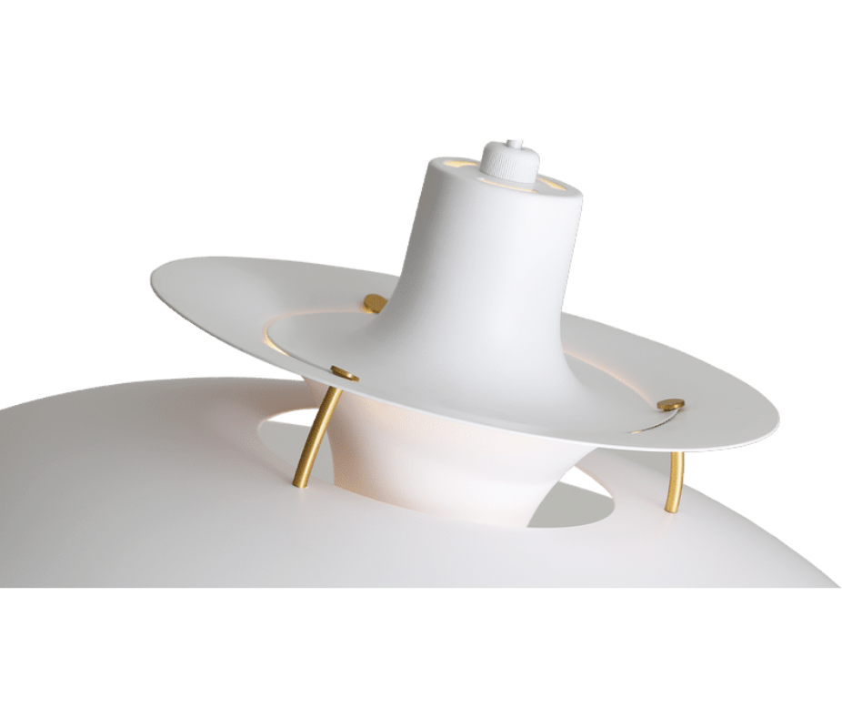 The beautifully understated design provides 100% glare-free light. The Henningsen design incorporates a reflective three-shade system, A warmer tone of light is created by the inside red cone and a small blue reflector., which directs most of the light downwards, with some lateral light spilling outward, thus illuminating Henningsen itself.